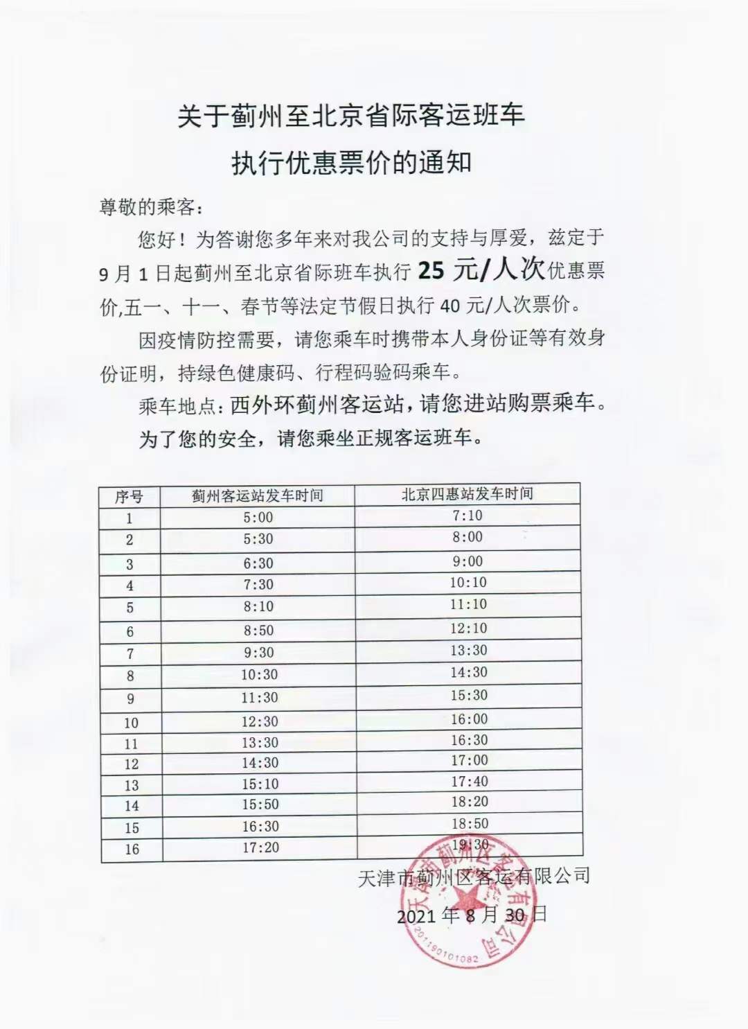 薊州至北京省際客運(yùn)班車執(zhí)行優(yōu)惠票價